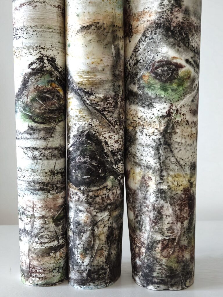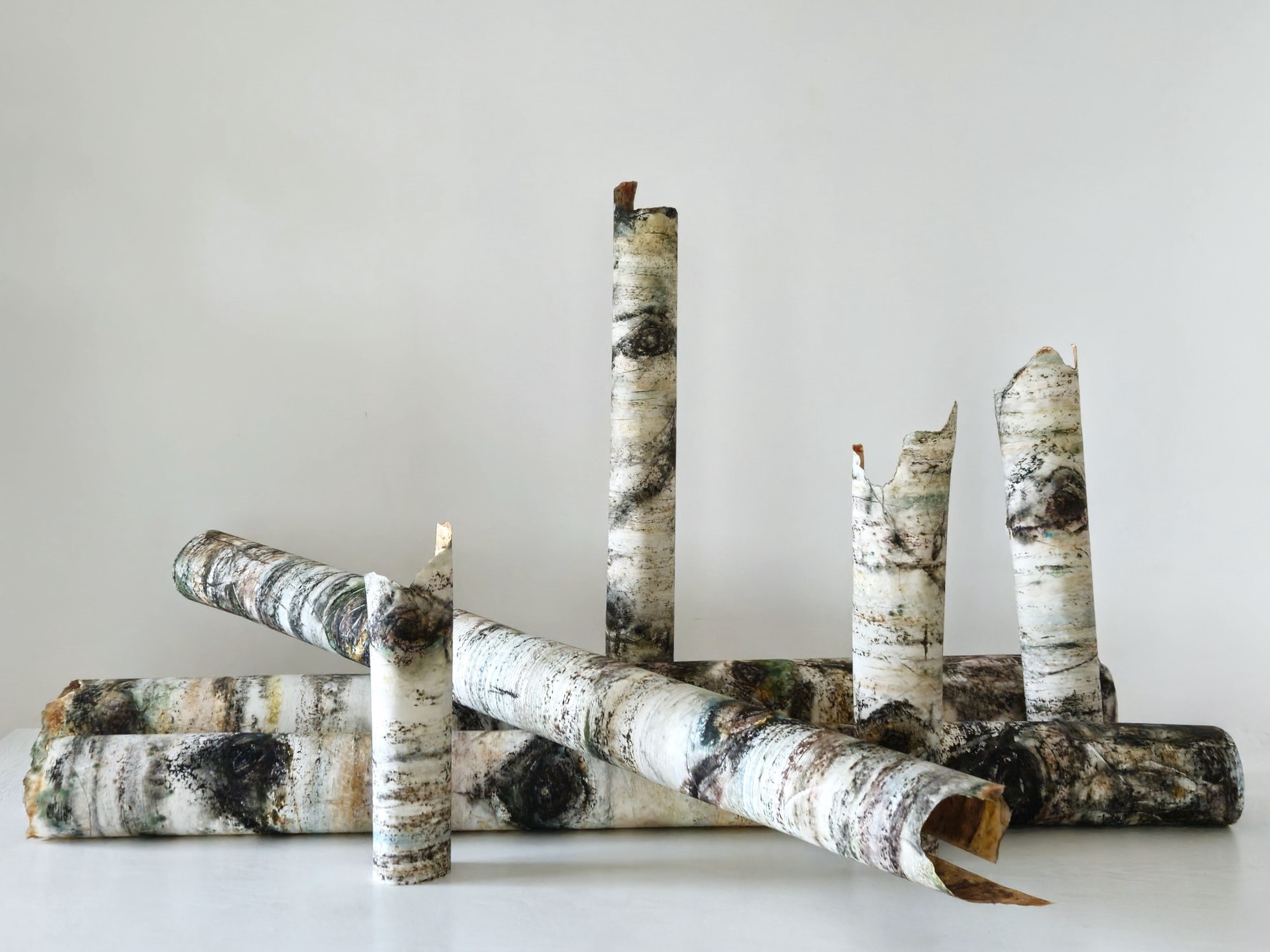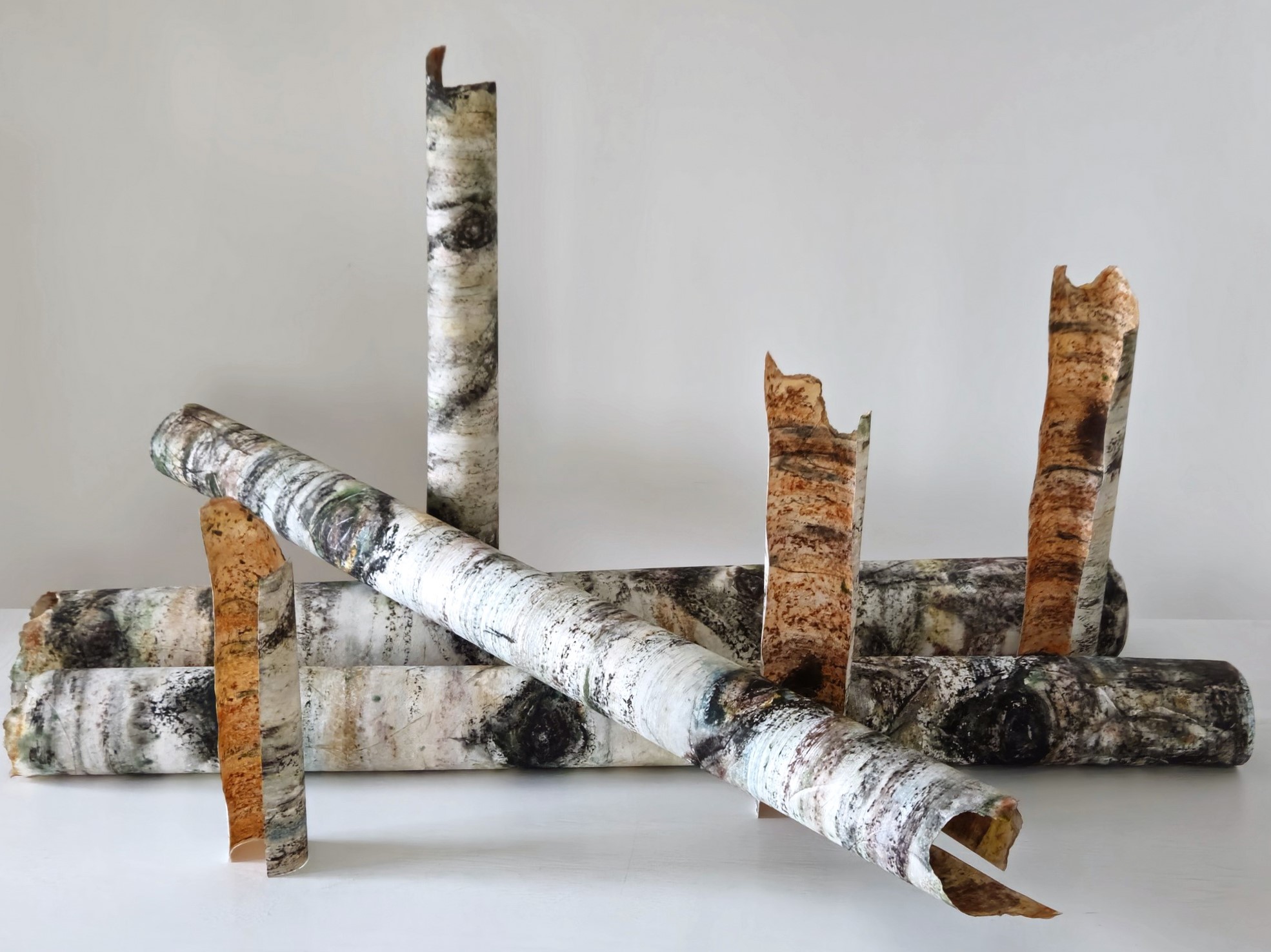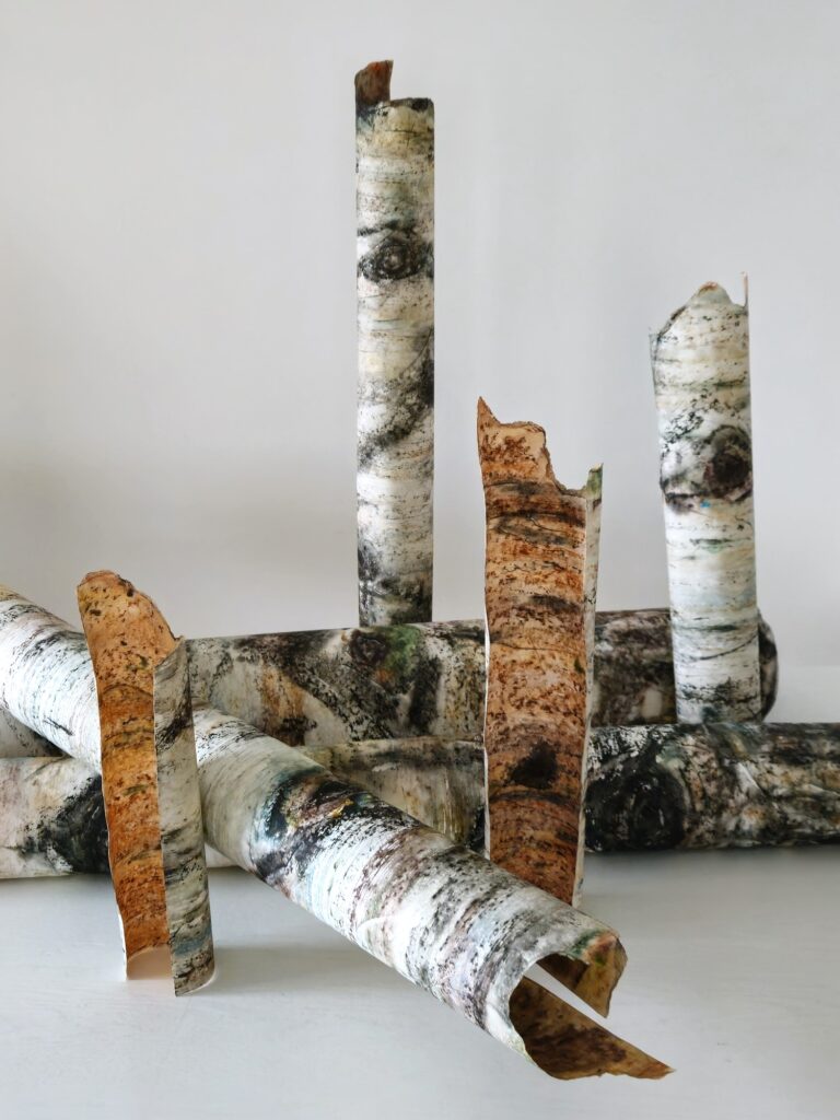 Seven double-sided painted sheets, rolled in cylindrical form, dimensions: 45×125 cm, 35×125 cm, 30×125 cm, 25×60 cm, 20×40 cm, 20×47 cm. 2025.