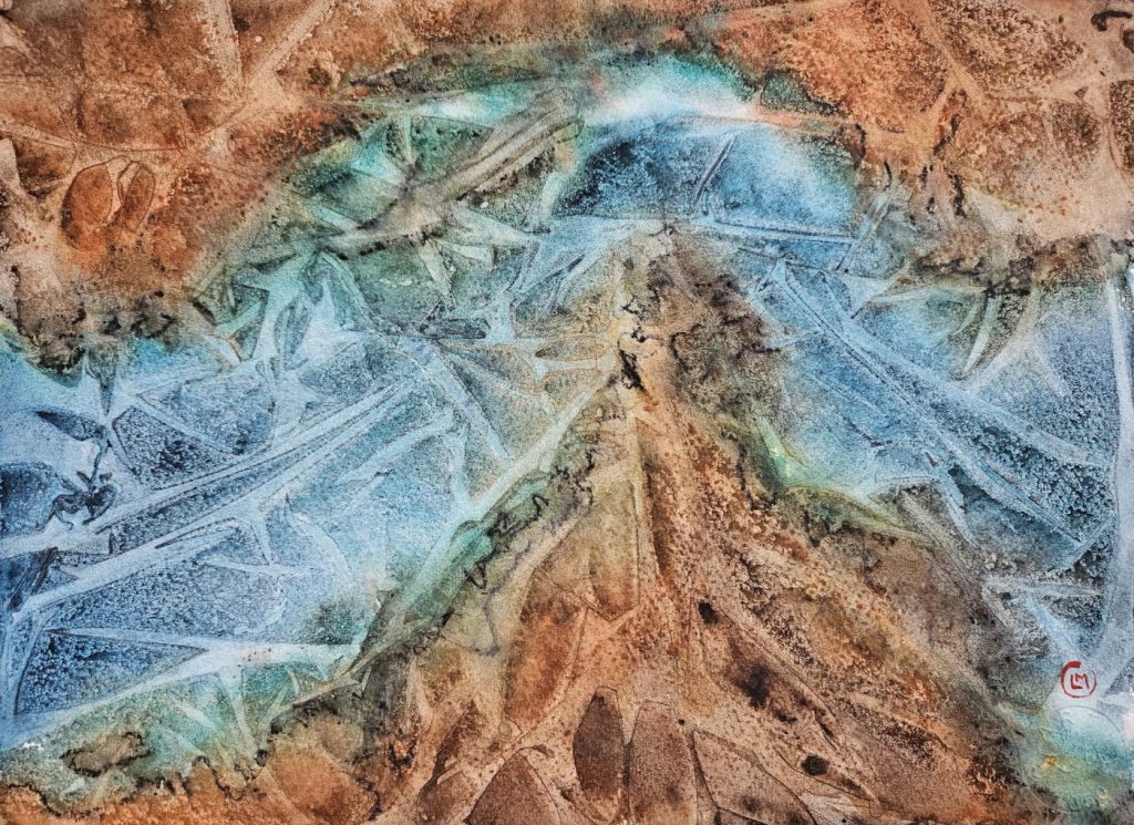 Tecnique: Granulating watercolor pigments and Lunar Black pigment Daniel Smith watercolor on Lanaquarelle paper, sizes: 56×76 cm, 28×38 cm, 19×28 cm, 2022-2023.