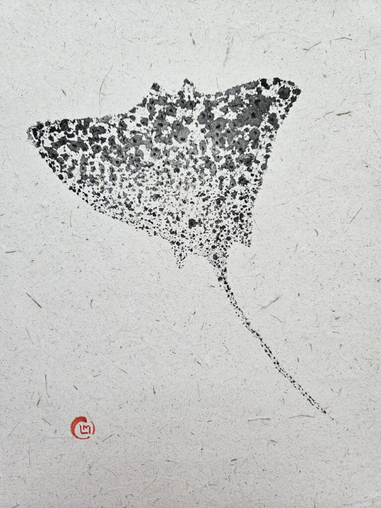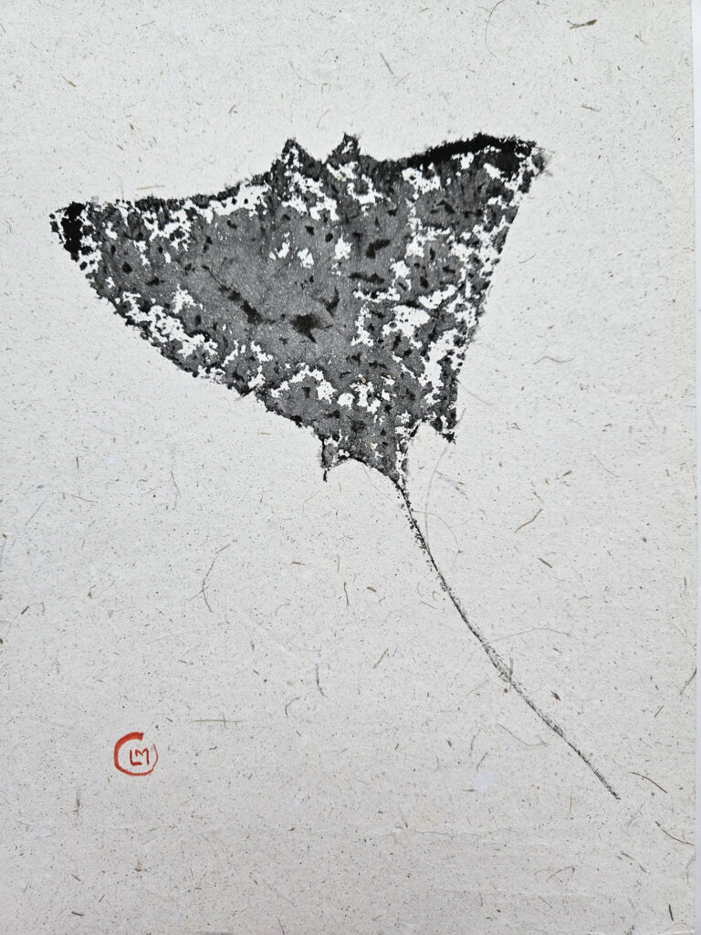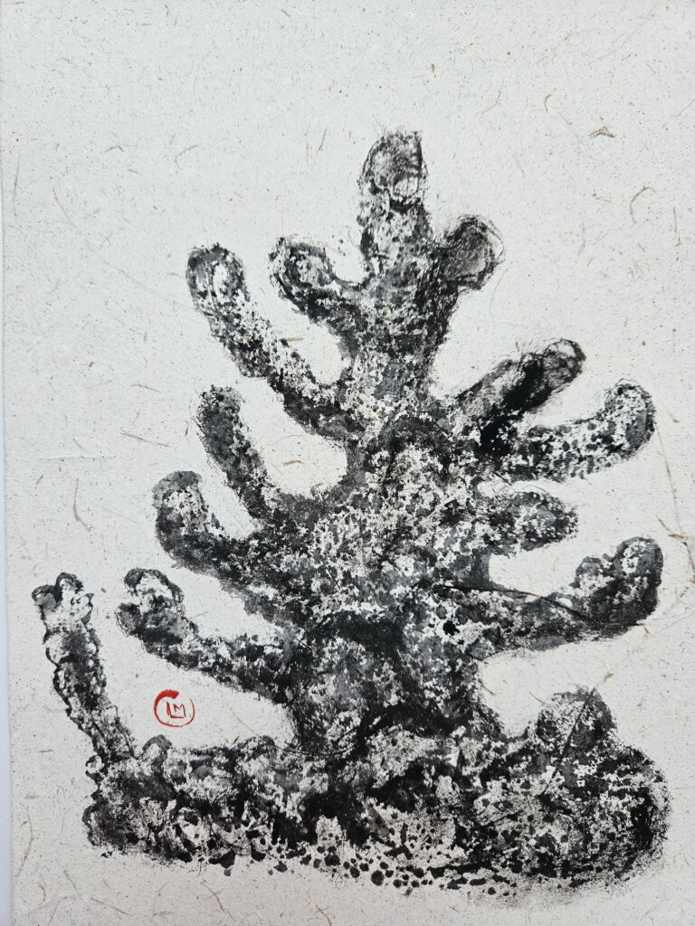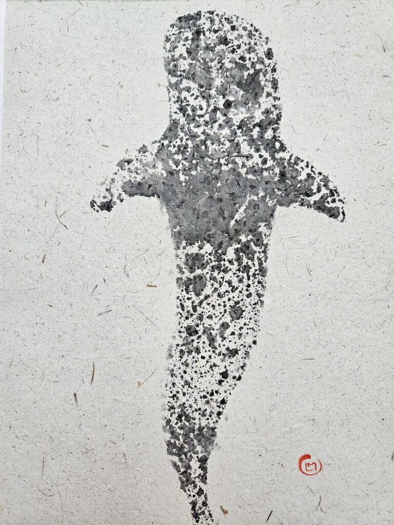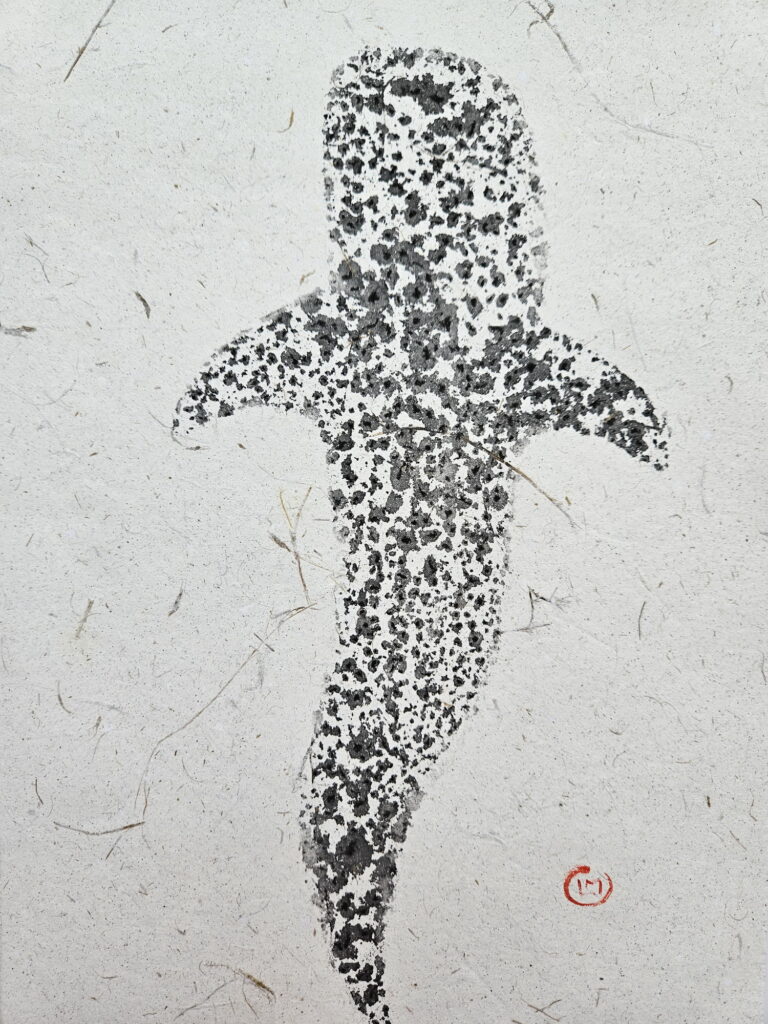 In 2025 I traveled to the Maldives, where I was fascinated to discover the coral atolls. There I saw a diverse marine fauna. Inspired by this, I created a series of works in the Gyotaku style (but not real prints of the the animal). I illustrated species such as the sea turtle, the whale shark, the stingray, and various coral species. I used handmade paper obtained from recycled elephant dung, produced in Sri Lanka.
