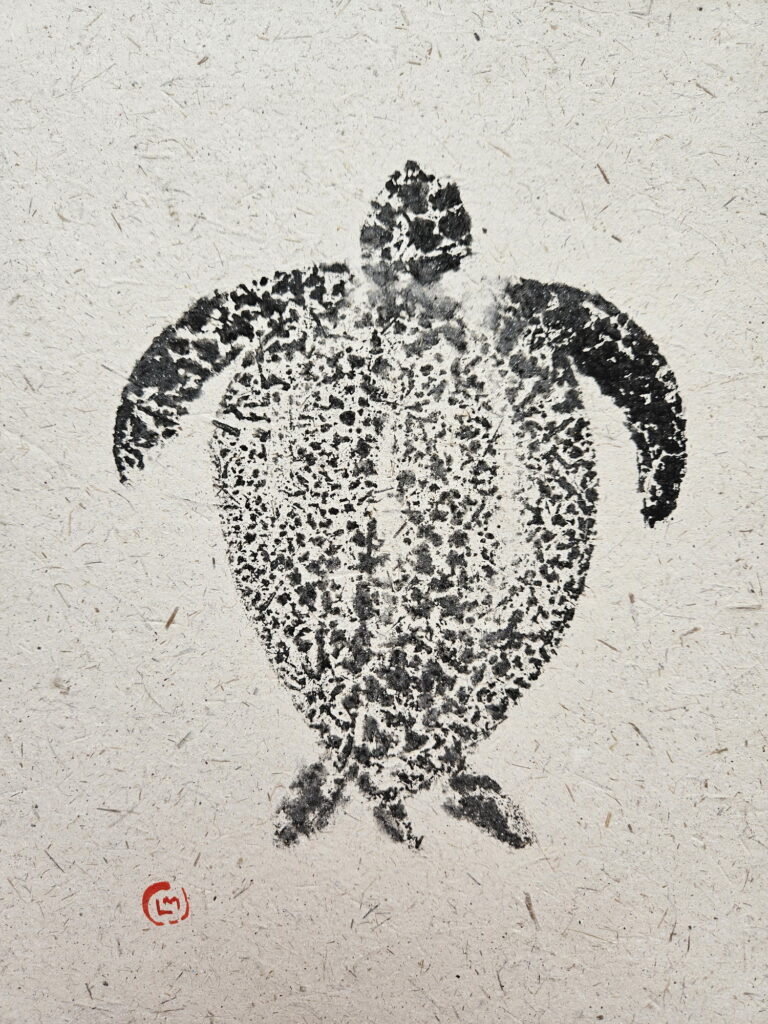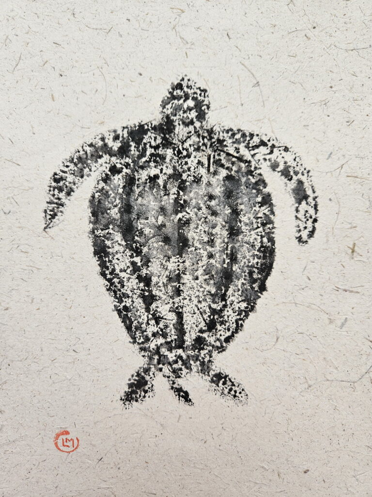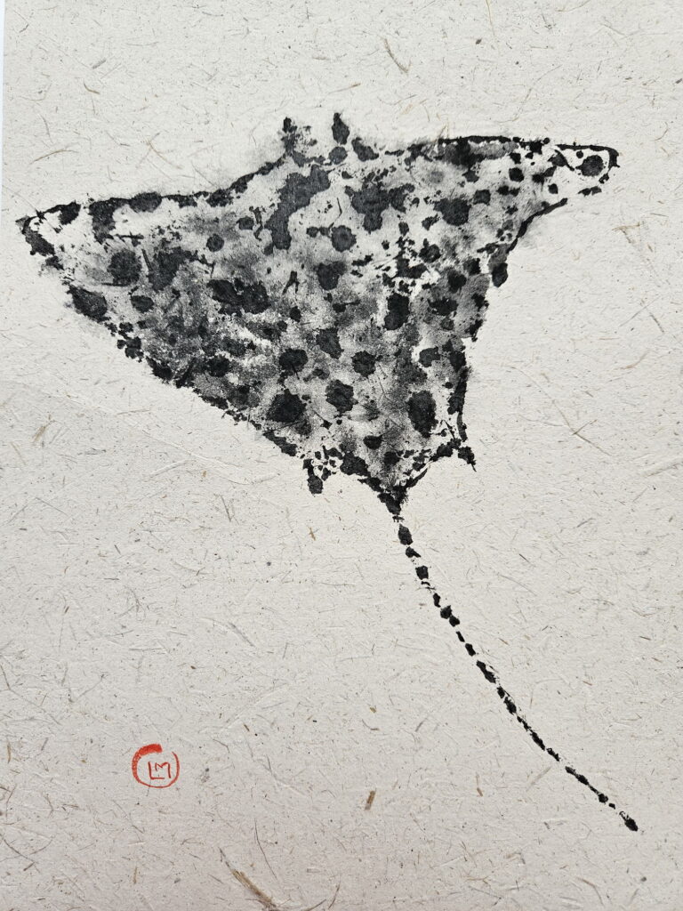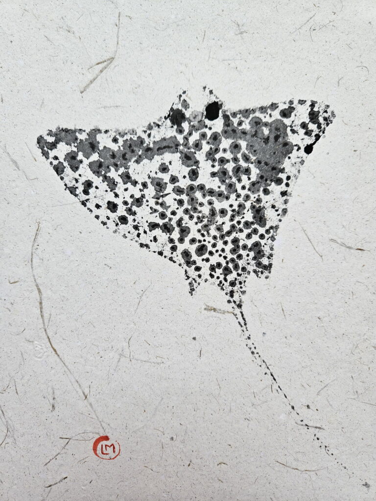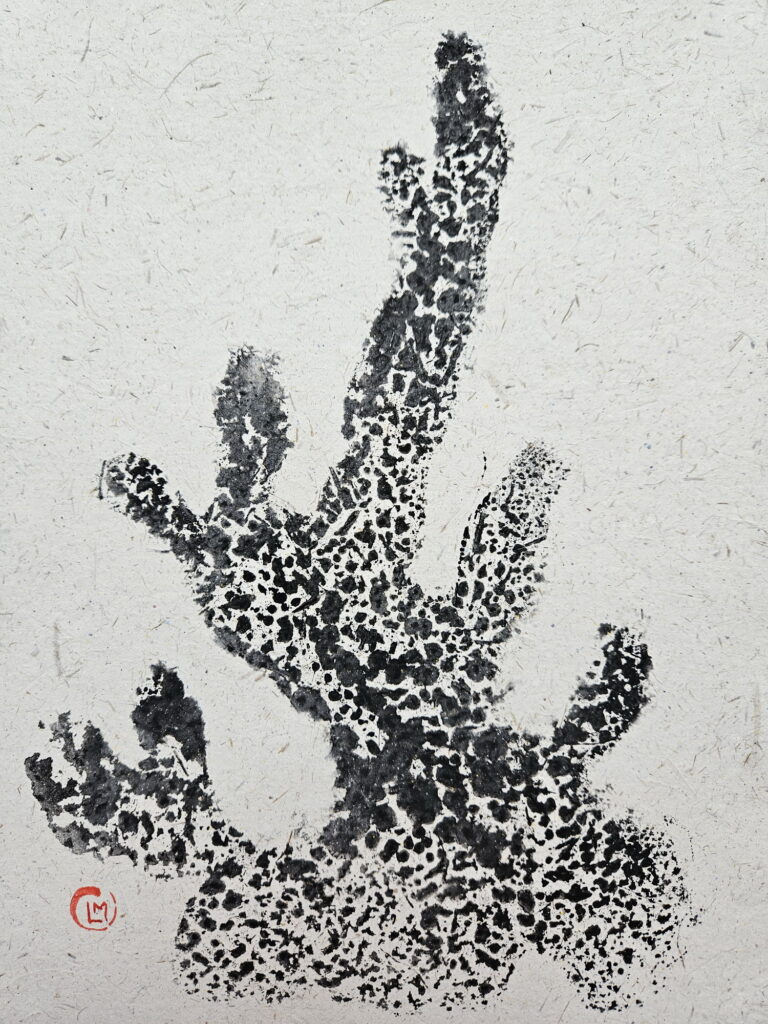 In 2025 I traveled to the Maldives, where I was fascinated to discover the coral atolls. There I saw a diverse marine fauna. Inspired by this, I created a series of works in the Gyotaku style (but not real prints of the the animal). I illustrated species such as the sea turtle, the whale shark, the stingray, and various coral species. I used handmade paper obtained from recycled elephant dung, produced in Sri Lanka.