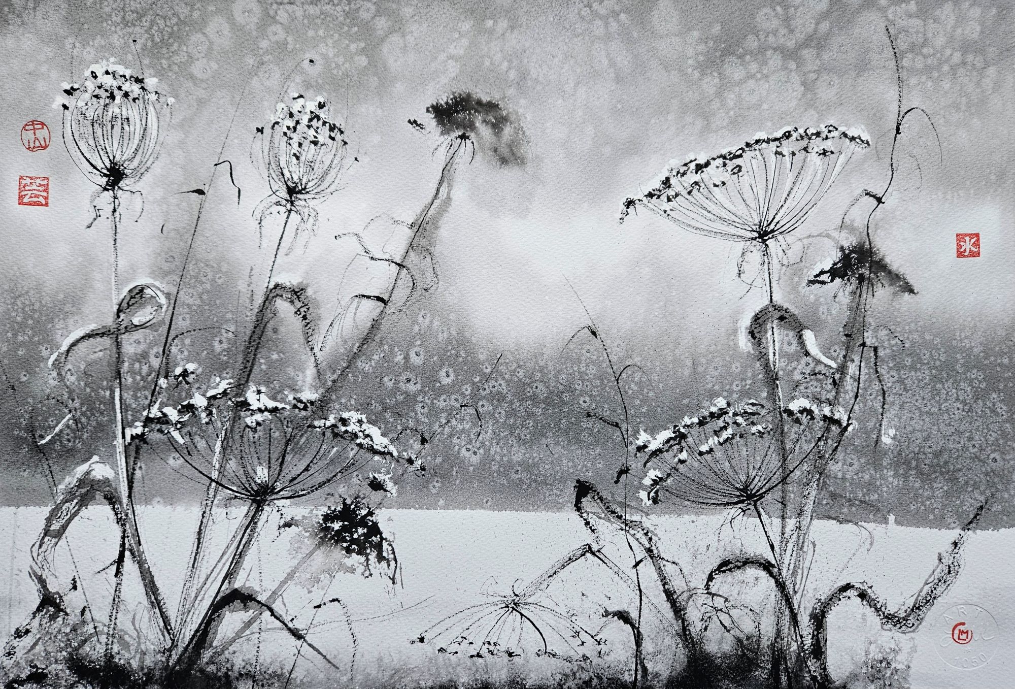 Between 1994-1995 I was employed at ARTFIL, the porcelain factory in Sighisoara, where I worked as a ceramist painter. There I had the opportunity to experiment with minimalist painting techniques and became passionate about Asian art. Later I returned to this genre in watercolor painting. The works featured in this exhibition are painted with liquid charcoal and calligraphic ink on professional 100% cotton Lanaquarelle watercolor paper, 300g/m. This monochrome approach, where we used only shades of gray and black, was a challenge in rendering the winter atmosphere. The briars on thistles, the reeds in the snow or the willow branches in the thick fog are all actually imaginary landscapes. In reality I have seen them before, in frosty and snowy winters of another time, not like the present one. I tried to reproduce the frozen air with the flakes shattered by the blizzard or the fragility of some plants caught in the snow, those moments between day and night, ephemeral anyway.
